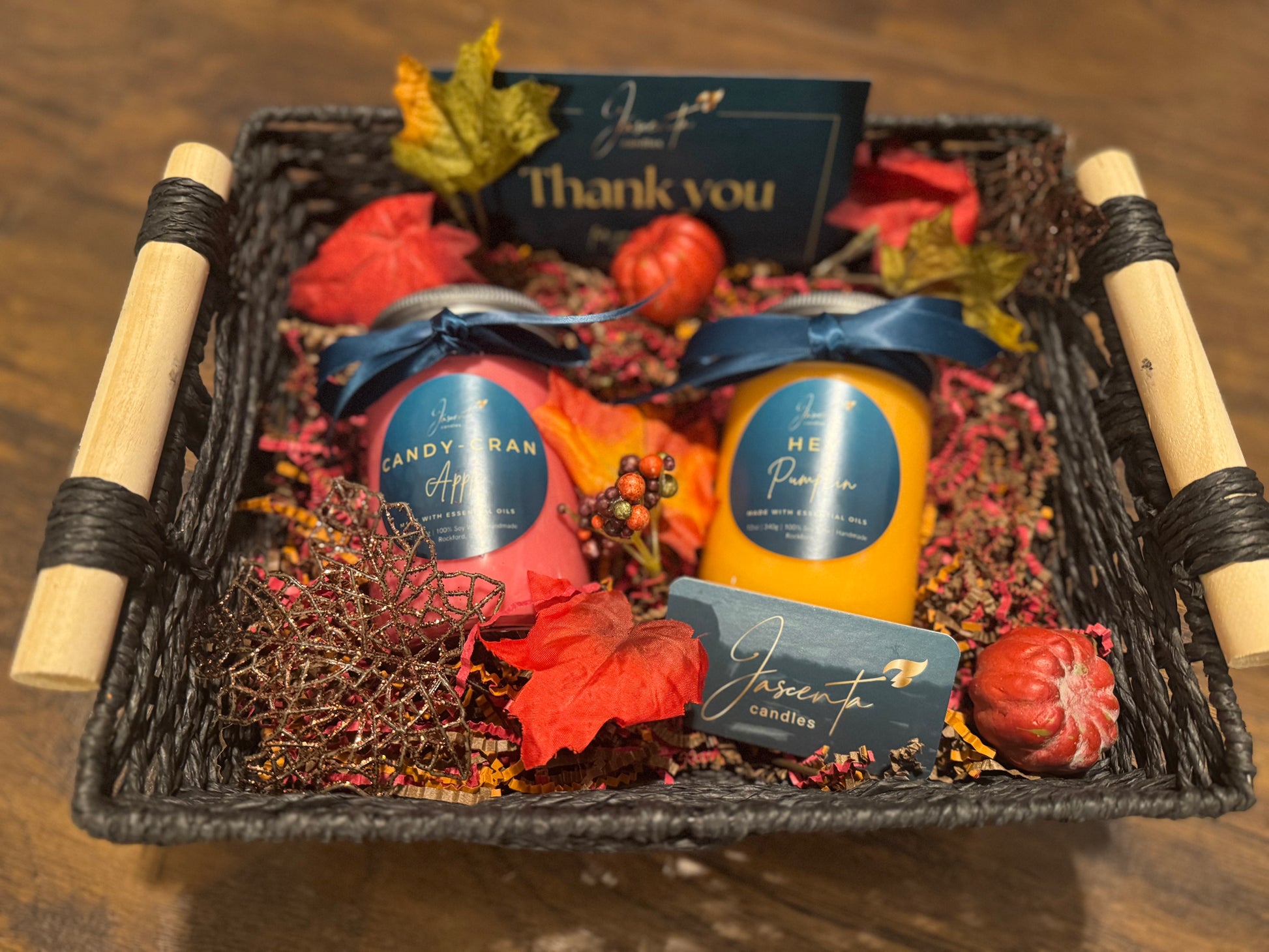 The basket includes one 12oz mason jar candle, one vessel candle, one wax melt, and one 4oz tin candle.